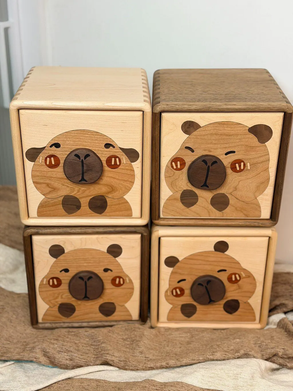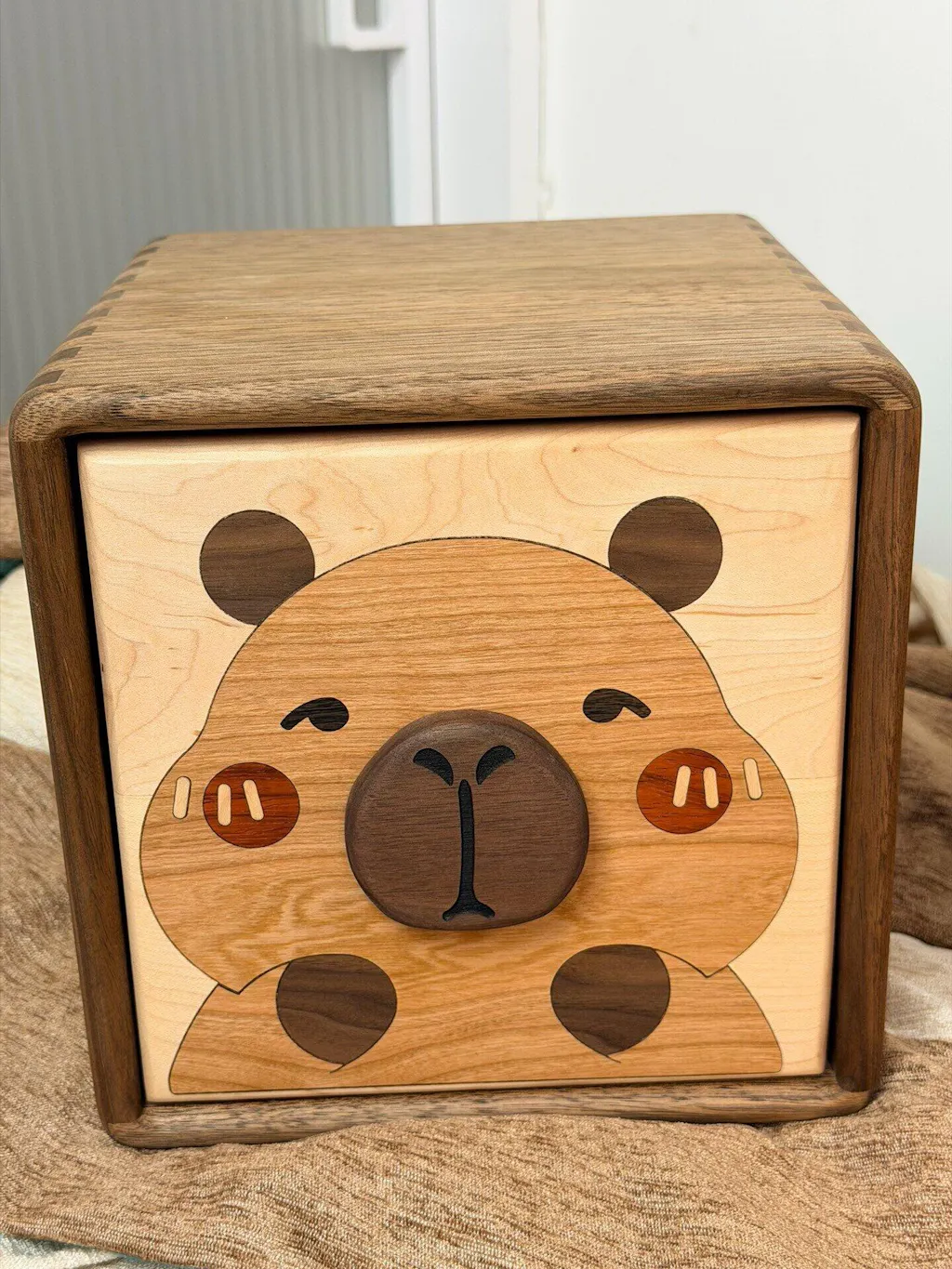 Each storage box is meticulously crafted using premium North American Black Walnut and Cherry wood. We use a sophisticated multi-tone wood inlay technique to create the iconic, peaceful expression of the Capybara on the drawer face. The natural grain of the wood ensures that every single piece is unique, offering a warm, tactile experience that plastic or MDF alternatives simply cannot match.